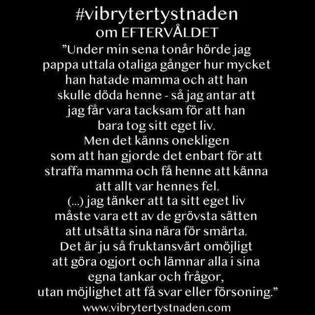 Under min sena tonår hörde jag pappa uttala otaliga gånger hur mycket han hatade mamma och att han skulle döda henne – så jag antar att jag får vara tacksam för att han bara tog sitt eget liv. Men det känns onekligen som att han gjorde det enbart för att straffa mamma och få henne att känna att allt var hennes fel. Som tur är har hon inte tagit på sig ”skulden” för detta. Hon är stark och har fått rätt stöttning från vänner och familj. Men jag tänker att ta sitt eget liv måste vara ett av de grövsta sätten att utsätta sina nära för smärta. Det är ju så fruktansvärt omöjligt att göra ogjort och lämnar alla i sina egna tankar och frågor, utan möjlighet att få svar eller försoning.