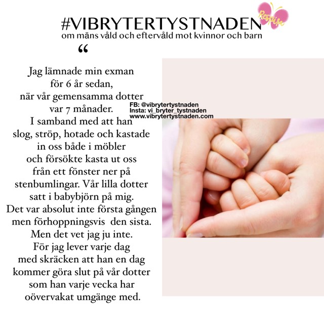 Jag lämnade min exman för 6 år sedan, när vår gemensamma dotter var 7 månader. I samband med att han slog, ströp, hotade och kastade in oss både i möbler och försökte kasta ut oss från ett fönster ner på stenbumlingar. Vår lilla dotter satt i babybjörn på mig. Det var absolut inte första gången men förhoppningsvis sista gången. Men det vet jag ju inte. För jag lever varje dag med skräcken att han en dag kommer göra slut på vår dotter som han varje vecka har oövervakat umgänge med.