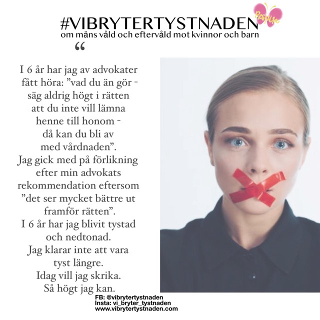 Föräldrars rätt till sitt barn är så stark i Sverige. Familjerätten och socialtjänsten hänvisar till ”barnets bästa”. HUR FAN kan ett barns bästa vara att tvingas vara med sin våldsman!? Kvinnor uppmanas lämna, men barnen, som är försvarslösa, ska vara kvar utan skydd!?Häromdagen sa min dotter ”jag vet att jag måste mamma så jag gör det, det är ok mamma”. Det gjorde så ont. Hon har försökt göra sin röst hörd i 5 år, men ingen har lyssnat, inte ens hennes mamma, åtminstone utifrån hennes perspektiv. Så hon gav upp. 6 år gammal.